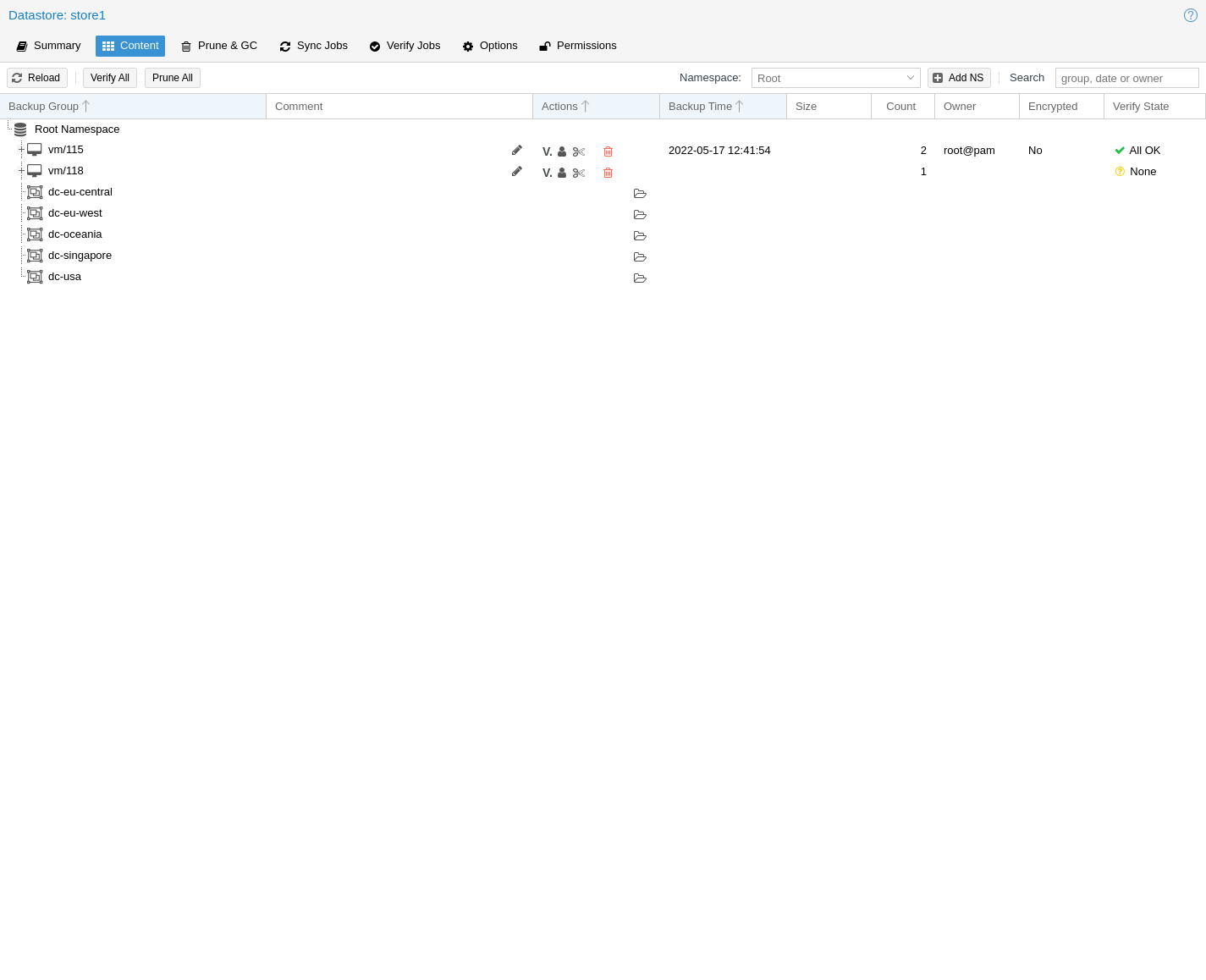Once you've uploaded some backups or created namespaces, you may see the backup type (ct, vm, host) and the start of the namespace hierarchy (ns).