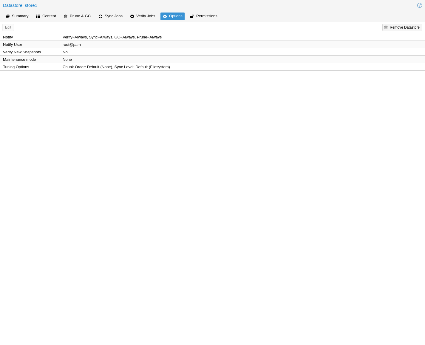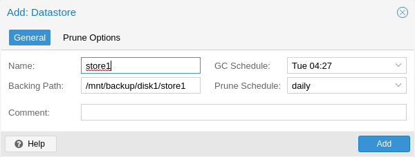 # proxmox-backup-manager datastore create store1 /backup/disk1/store1