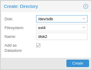 It is also possible to create them on completely unused disks through "Administration" > "Disks / Storage" > "Directory", using this method the disk will be partitioned and formatted automatically for the datastore.